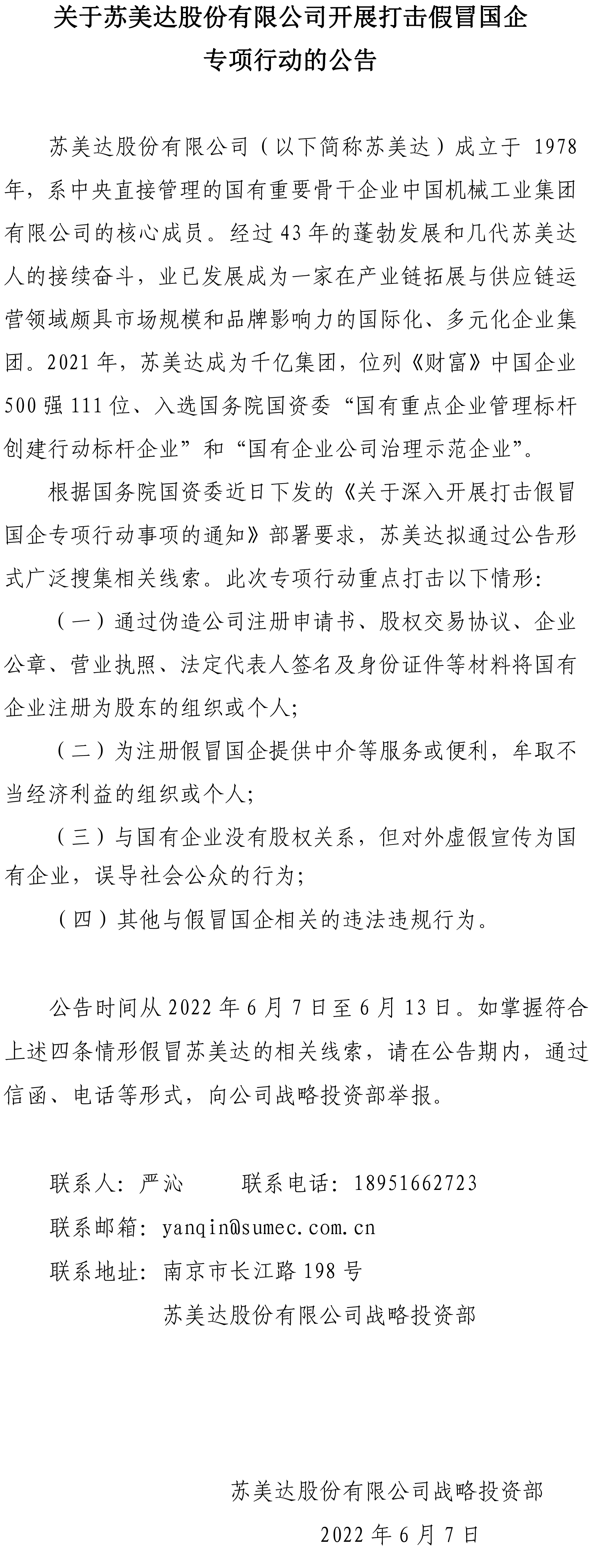 關(guān)于蘇美達(dá)股份有限公司開展打擊假冒國企專項(xiàng)行動(dòng)的公告